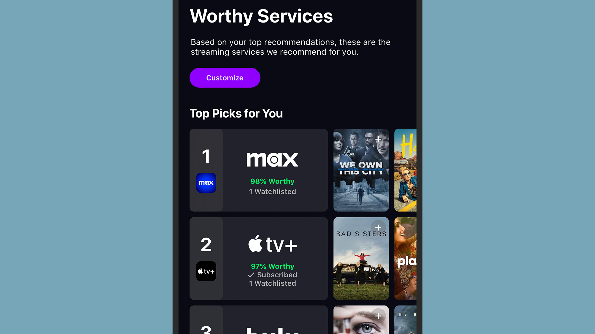 Most importantly for this article, if you tap on Discover, you’ll see a link for Recommended Services: If you tap on Find Out Now, Watchworthy then tells you which streaming services are best for you, based on your recommendations and watchlist. Tap Customize to change the selection based on everything that’s ever aired on a service, or what’s been made available to stream recently.